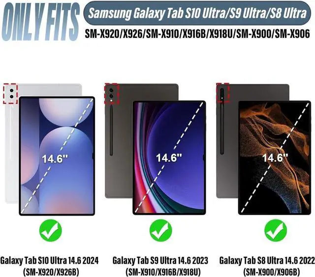 Compatibility: This 14.6 -inch Keyboard Case is compatible with Newest Samsung Galaxy Tab S10 Ultra 14.6 -inch 2024(SM-X920/X926B/X926N/X920N), Tab S9 Ultra 14.6 inch (SM-X910/X916/X918, 2023), Tab S8 Ultra 14.6 inch (SM-X900/X906, 2022). It will only work for the above model device.