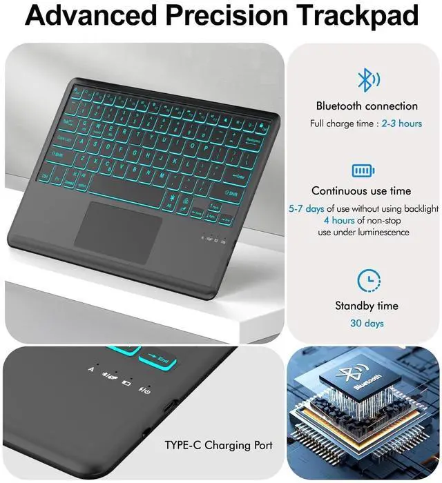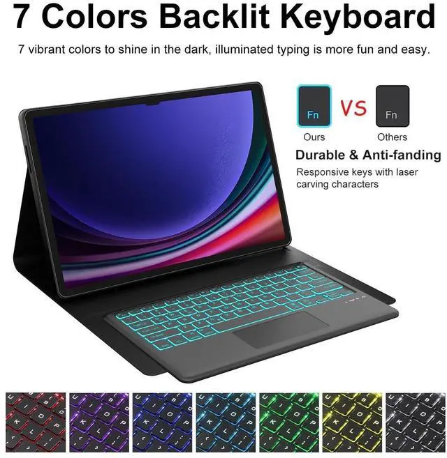 Colors Backlit Keyboard: S9 Ultra keyboard case with a customizable 7-color RGB backlight keyboard (adjusted via FN keys). Adjustable brightness enhances typing in any lighting condition, offering 3-tier brightness control. Choose your preferred color and brightness to match your environment, ensuring comfortable typing day or night ^^ Magnetic Detachable