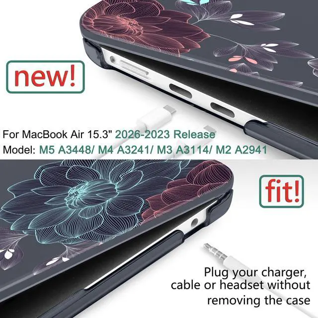 Compatibility -- Only designed for MacBook Air 15 Inch 2026 2025 2024 and 2023 with Touch ID and Liquid Retina Display (Models M5 A3448, M4 A3241, M3 A3114, M2 A2941). Check your device model before purchasing. ^^ Durable Material -- Made of hard plastic to protect against scrapes and scratches without adding bulk. Features long-lasting, vibrant patterns. ^^ Easy Installation & Removal -- Micro clips ensure secure attachment and easy removal. ^^ Ventilation -- Ventilation holes at bottom for safe heat dissipation and raised rubber feet prevent slipping ^^ Complete Package -- Includes a protective case, a keyboard cover, dust plugs, and a screen protector.