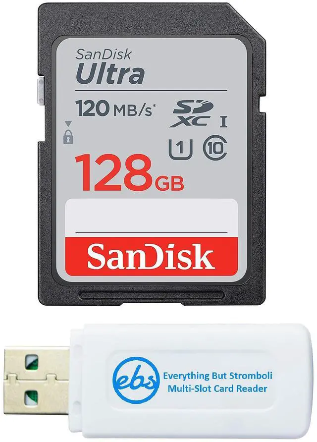 Bundle includes (1) SanDisk 128GB Ultra 120mbs Memory Card and (1) Everything But Stromboli Combo Card Reader.