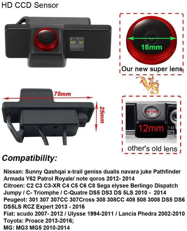 Dear customer, Please must check the camera size and appearance before place a order, see if can fit your car license plate lamp place size and appearance! Because the same car model in different countries may have some difference, please check the camera size and compare the installation of your car carefully to avoid mistake. This product could fit for all below models as expected: Sunny Qashqai x-trail geniss dualis navara juke Pathfinder Armada Y62 Patrol Royale/ note qoros 2012- 2014