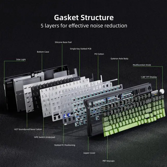 ^^ Gasket structure design: Thickened silicone gasket and PCB single key slotting, optimize the key elasticity and stability.