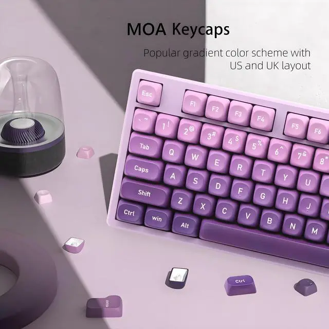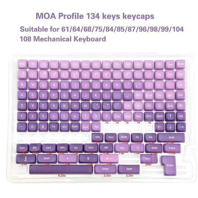 MOA KeycapsThe keyboard caps feature an MOA (Molded Organic Angles) profile, with rounded edge designs that deliver excellent tactile feedback. Whether for typing or gaming, fingers glide smoothly across them while enhancing the keyboard's "thocky" sound signature ^^ 5 Side Dye Sublimation Keyboard KeycapsThe MOA keycap set adopts advanced five-sided dye-sub process, the color is more vivid, not afraid of oil stains, and has a long service life. ^^ Widely CompatibilityThe keycap set includes 134 keys (104 standard keys + 30 modifier keys), compatible with both Cherry MX and Gateron MX switches.