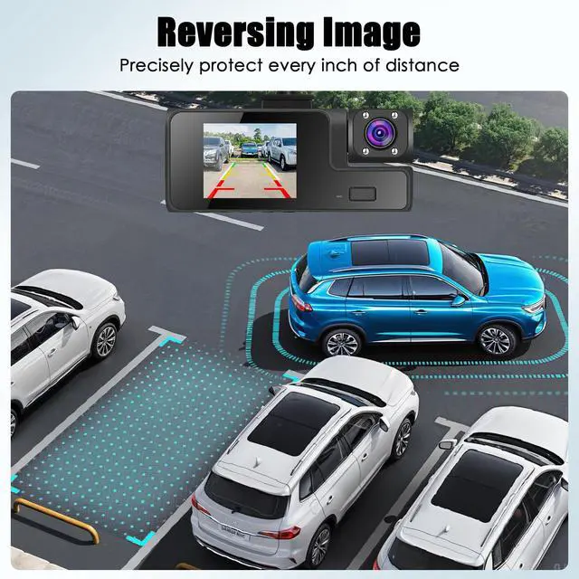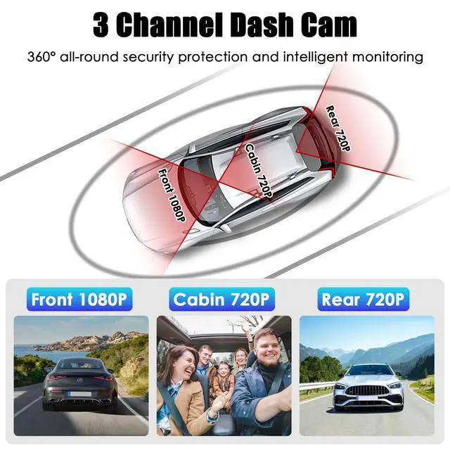 Three-Channel Full Coverage: 1080P FHD front camera (170 wide-angle) + 720P interior camera (120) + 720P rear camera (90) for blind-spot-free protection. The front lens delivers crisp details while the rear monitor keeps you aware of traffic behind, and PIP mode simultaneously captures evidence inside and ahead during collisions. ^^