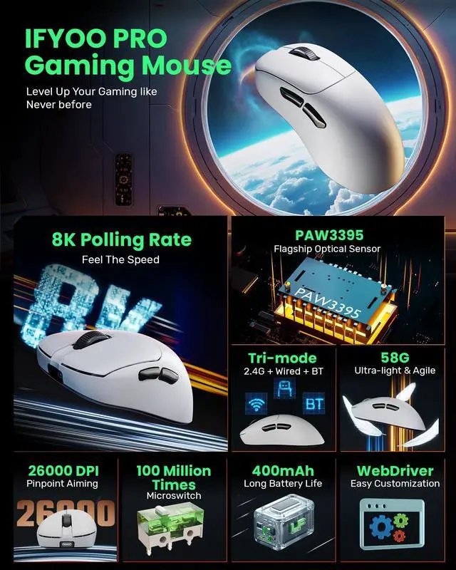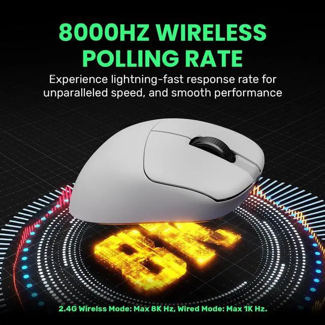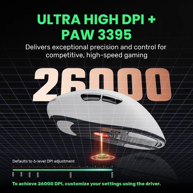 Please note: 4K polling rate only works on 2.4G hz Mode. ^^ 58G LIGHTWEIGHT, 400MAH BATTERY, SUPERIOR GRIP & PARACODE CABLE - Master every move with a remarkably lightweight 58g design for effortless control. The smaller size ensures a natural grip, whether you use Fingertip Grip or Claw Grip. 1.6 m Paracord cable for exceptional flexibility. ^^ CUSTOMIZATION DRIVER - Fine-tune your mouse to match your playstyle. Adjust DPI and Polling Rate for pixel-perfect precision or lightning-fast movement. Program macros for complex in-game actions, and map buttons for intuitive control. It has a beta Web Driver.