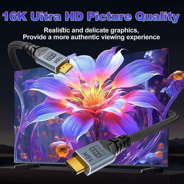 4:4: 4 full chroma sampling technology enables pixel-perfect ultra-clear resolution for both movie scenes and gaming environments, restoring the original details of every frame. ^^ eARC Hi-Fi Audio, Immersive ListeningThe Enhanced Audio Return Channel (eARC) enables lossless transmission of Dolby Atmos, DTS: X, and 7.1 -channel surround sound. Pair it with a soundbar or home theater system to instantly immerse yourself in the center of the soundstage! Supports 32-bit/1536kHz high-definition resolution, combined with Lip Sync Optimization (LIP) technology for zero audio-visual latency and studio-grade original sound quality. ^^ Full-Scenario Gaming Optimization, Win by MillisecondsTriple boost from Variable Refresh Rate (VRR) + Auto Low Latency Mode (ALLM) + Quick Media Switching (QMS), with 1ms ultra-fast response to completely eliminate black screens, stutters, and format switching delays. Tailor-made for PS5/Xbox Series X^^S, the 480Hz full-frame high refresh rate, paired with triple electromagnetic interference (EMI) shielding, ensures seamless FreeSync/G-SYNC collaboration for a zero-interference, ultra-smooth competitive gaming experience. ^^ Military-Grade Durability, Lossless SignalHardcore support from triple shielding structure + high-quality craftsmanship: three-layer braided nylon outer jacket, aluminum alloy housing, and gold-plated connectors deliver maximum EMI resistance, withstanding over 45, 000 bends without damage. 28AWG high-purity tinned copper conductors guarantee uninterrupted, distortion-free long-distance transmission of 8K HDR signals, with both durability and stability at the top level. ^^ Wide Device Compatibility, Plug-and-PlayThe 16K HDMI 2.2 Cable seamlessly works with 4K/8K/16K TVs from brands like Samsung, LG, and Sony, gaming consoles including PS5/PS4 and Xbox Series X/S, as well as next-gen gaming PCs with NVIDIA RTX 40 Series and AMD RX 7000 Series graphics cards. It also supports full-range devices such as soundbars, AV receivers, Blu-ray players, and projectors, while fully backward compatible with HDMI 2.1 / 2.0 / 1.4 and HDCP 2.2 / 2.3 protocols, offering flexible adaptation for home audio-visual setups and gaming configurations.