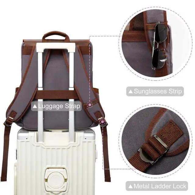 MULTI-POCKET & TROLLEY SLEEVE: A total of 7 pockets - 1 roomy main compartment for clothes with 1 thicken padded laptop compartment and 1 zipper pocket; the front side has 1 zipper pocket and 1 botton pocket; the sides has 2 pockets for water bottle or umbrella. The back has a trolley sleeve for fiting on your suitcase on the go. ^^ QUALITY DETAILSThe leather straps with magnetic fasteners give this satchel backpack retro looking and contemporary practicality. The clean sewing and the smooth zipper with two pulls guarantees its service life.