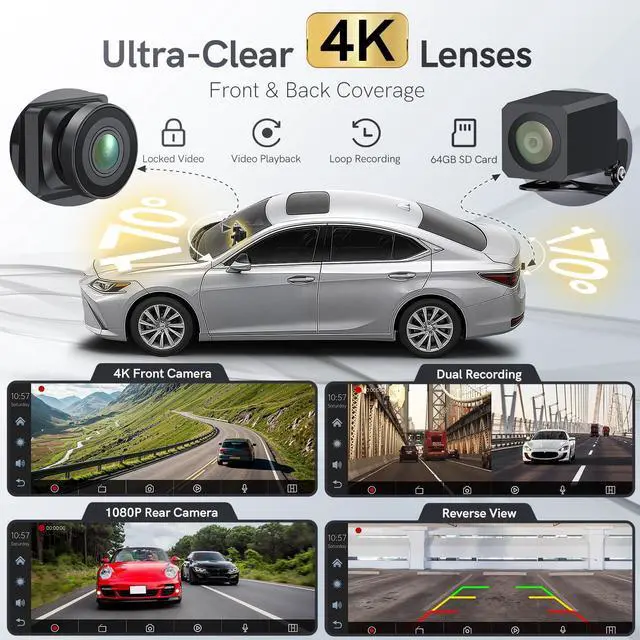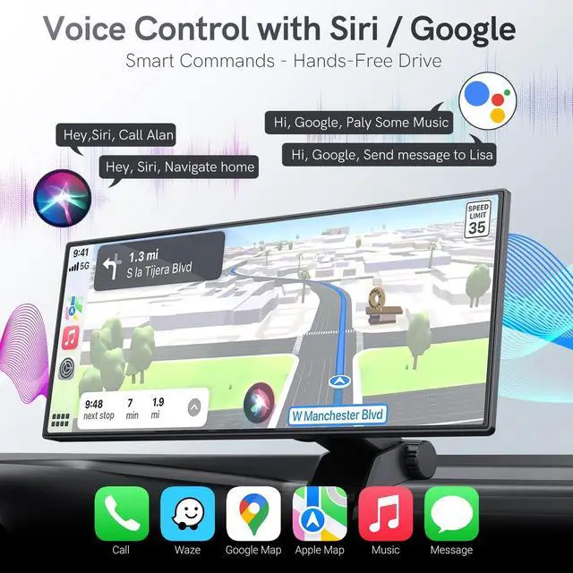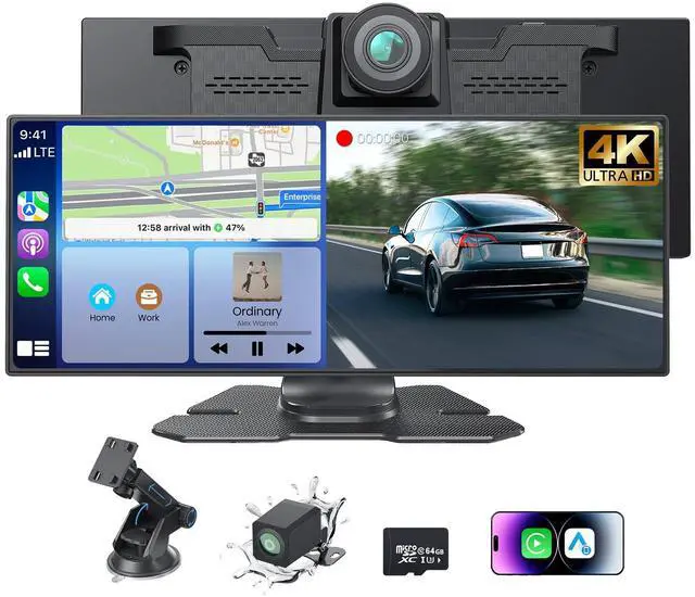 The wireless CarPlay screen connects via WiFi, letting you view, download, and share recordings on your smartphone. Includes a 64GB memory card for ample storage. ^^ 1080P Backup Camera with Enhanced Reverse Assist Reverse with confidence using our CarPlay 1080P backup camera for car. It auto-activates when reversing and features Night Vision, IP56 waterproofing, and customizable parking guidelines for clear, accurate maneuvering in any condition. A professional installation video is included for easy setup. ^^ Intelligent Voice Control Control navigation, calls, messages, and music hands-free with our Carplay Screen intelligent voice control, compatible with iOS (Siri) and Android (Google Assistant).