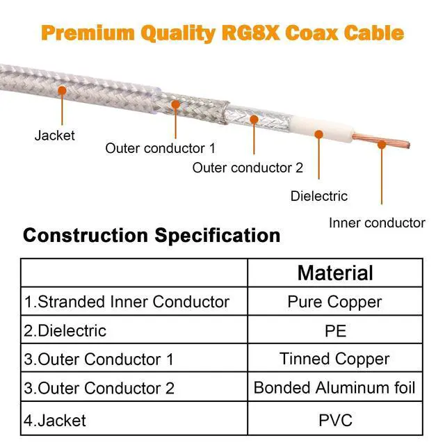 • Premium Materials -- The inner conductor of this cb coax cable is made with pure copper,outer conductor is made with Aluminum foil and tinned copper braid which can maximum protect the signal over large distance.Durable FEP jacket allows the rg8x cable exposure in outdoor harsh environments.