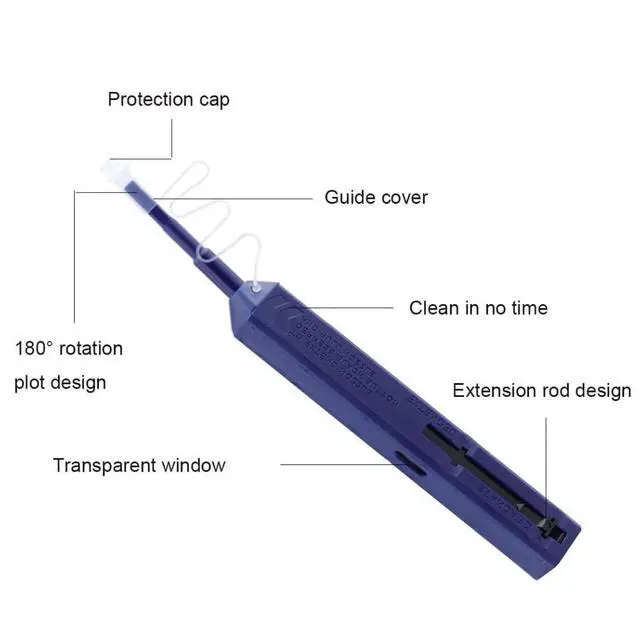 Product Description: Why to use the Fiber Optic Cleaning Pen? Dirty connectors cause a major percentage of fiber optic network failures; the simplest prevention is to clean the connectors. You can extend the life of the connector and minimize replacement costs if you keep the connector clean. In the optical fiber communication, even if the optical fiber connector plug end face with invisible dirt or small particles, may lead to the optical signal cut off, or cause the reflected wave damage to the optical fiber, or even damage the light source, causing significant damage to the overall communication system. So before the fiber connector is connected, the fiber connector ferrule (male), and the device must be cleaned.
