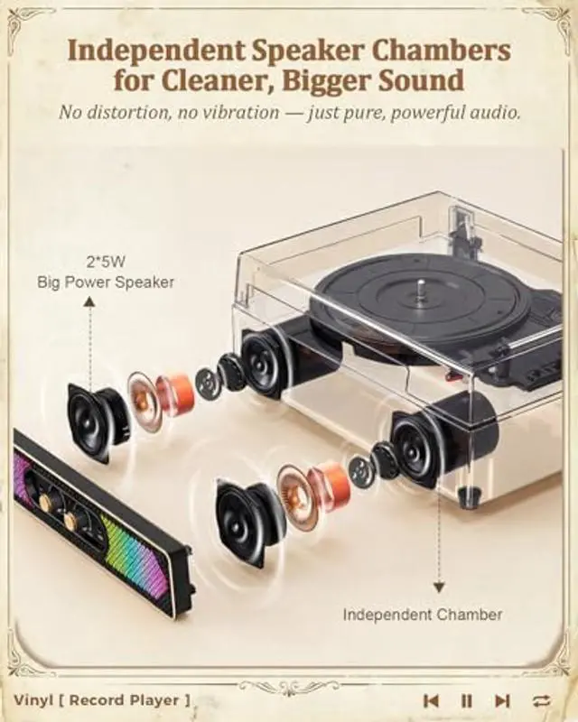 Mood: Create a cozy vinyl atmosphere with customizable RGB lighting that shifts from warm to vibrantperfect for relaxing evenings, study sessions, or adding decor-friendly glow to your bedroom or living room. A stylish Bluetooth record player that doubles as modern home decor ^^ Clearer Sound with Independent Sound Cavities +