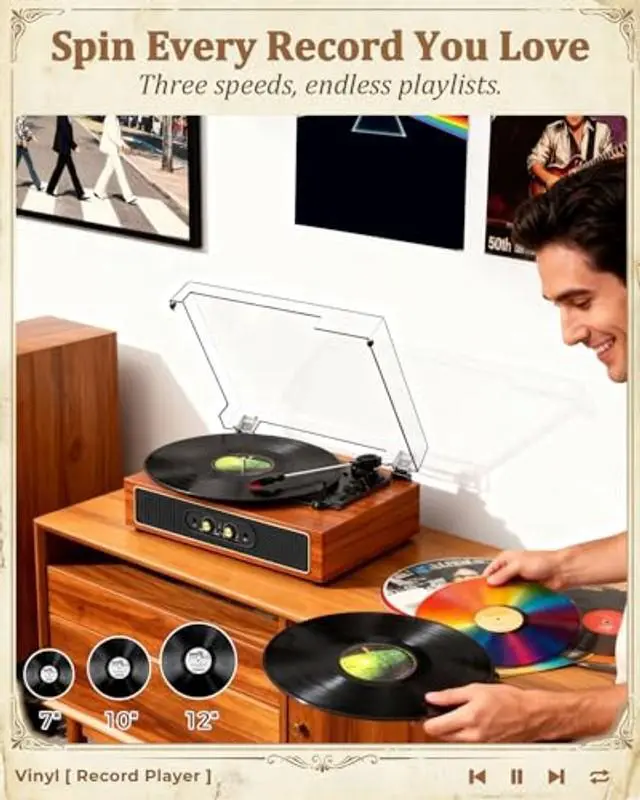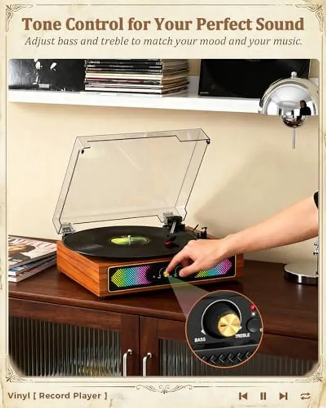 Tone Control: Built-in stereo speakers feature independent sound cavities for richer, cleaner audiono muffled sound, no distortion. Fine-tune your music with Bass & Treble knobs, giving vinyl lovers fuller lows and brighter highs. A great vinyl record player for beginners and collectors ^^ 3-Speed Belt-Drive Turntable with