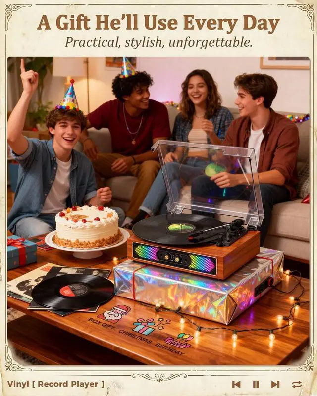 Headphone Listening Options: Stream music wirelessly via Bluetooth, connect devices through AUX, or hook up external speakers using RCA output for bigger sound. Prefer quiet moments? Plug in the headphone jack for private listeningideal for late-night vinyl sessions ^^ Warm Wood Design A Thoughtful Gift & Beautiful Decor Piece: The retro wood grain, gold-tone knobs, and RGB glow make this turntable a stylish accent in any home. A perfect vinyl player gift for birthdays, Christmas, housewarmings, or anyone who loves music, decor, or creating a relaxing mood at home