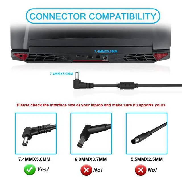 Connector Size: 7.4 mm x 5.0 mm. PLEASE CONFIRM THE SPECIFICATIONS OF YOUR MSI POWER ADAPTER BEFORE ORDERING!!! ^^