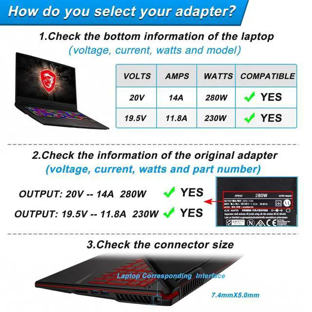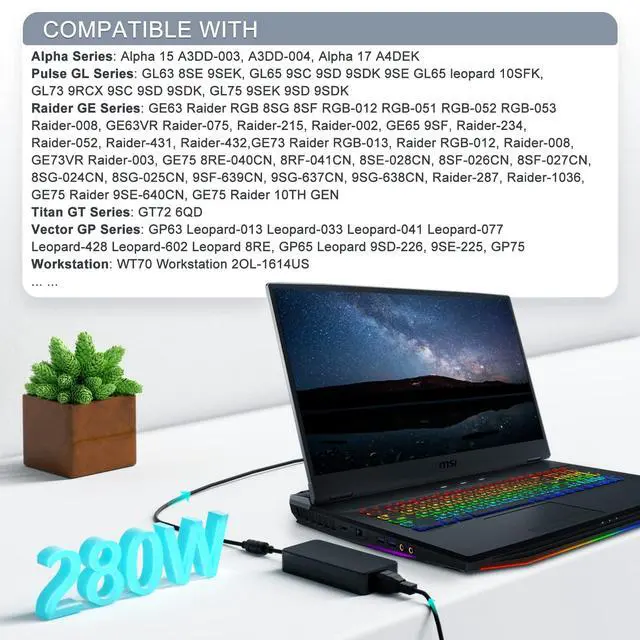 COMPATIBLE WITH MSI LAPTOP: Replacement for MSI 280W power adapter compatible with MSI GE75 Raider 8RF, GE75 Raider 8RE, GE63 Raider RGB 9SG, GE63 Raider RGB 9SF, GL65 leopard 10SFK, GP63 Leopard 8RE, GE63 GE63VR GE72MVR GE73 GE73VR GL63 GL73 Series Alpha 15 17 Laptop ^^ COMPATIBLE WITH MSI P/N & FACTORY MODEL: A18-280P1A, ADP-280BB B, ADP-230EB H, ADP-230EB T, MS-16U7, MS-17E1, MS-17E2, MS-17E9 ^^