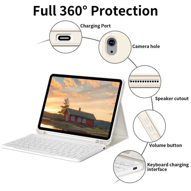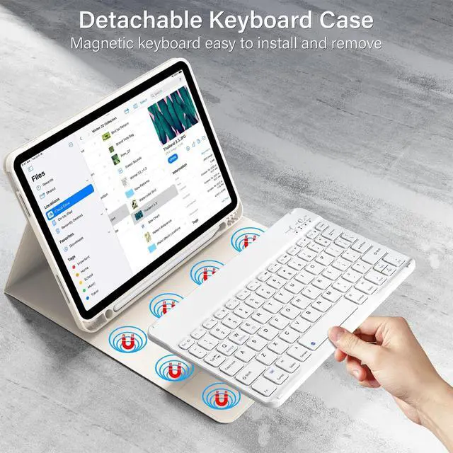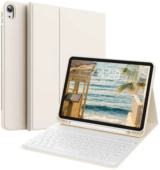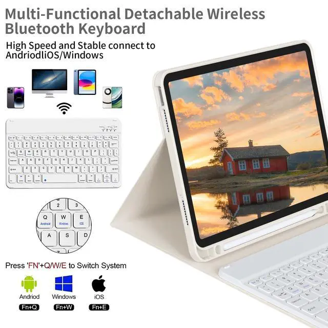 KVTVOU iPad keyboard case contains componentsTPU case and wireless bluetooth keyboard. TPU case1. The material is TPU case and leather cover. 2. Built-in pencil holder. 3. Auto sleep/wake. 4. Multiple Viewing Angles. 5. Precise cutouts. Wireless Bluetooth keyboard1. Wireless bluetooth. 2. Long battery life. 3. Auto Sleep. 4. Slim, lightweight, portable. 5. magnetic suction. Bluetooth keyboard connection instructions1. Turn on the keyboard. 2. Press the "Connect"button to 3 seconds. 3. Open the Bluetooth from settings in your IPAD and find the Bluetooth keyboard, then click and connect (Password free connection).