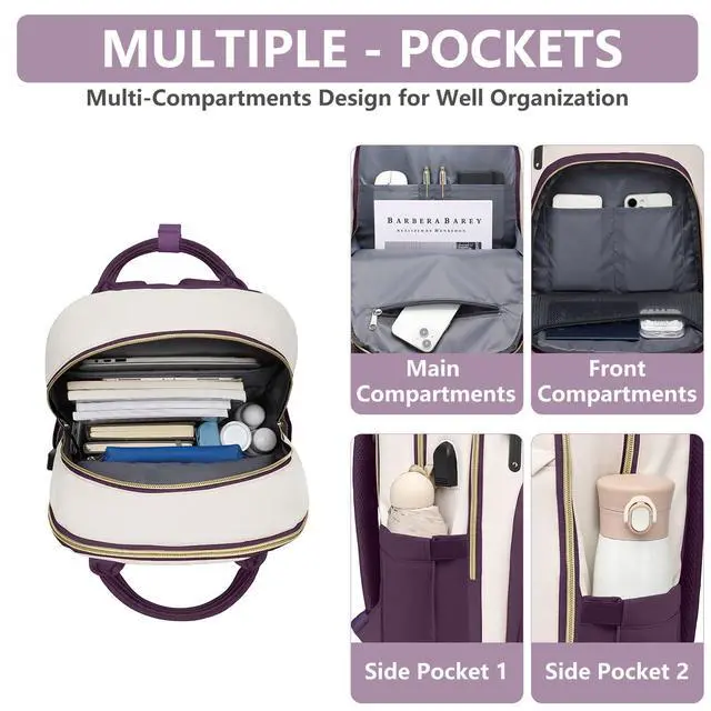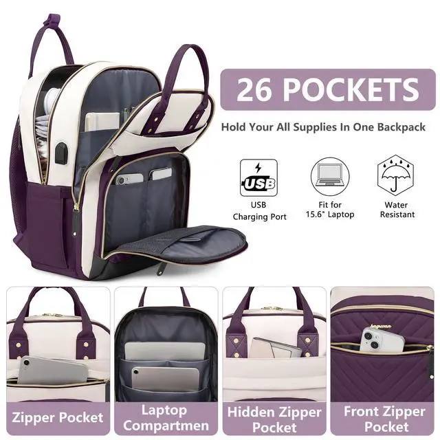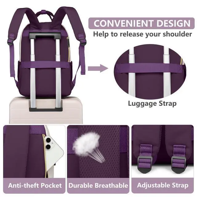 Large Capacity Backpack with Laptop Compartment- This laptop backpack features 4 compartments 26 pockets totally. The laptop compartment fit for 15.6 inch computer/chromebook. The main compartment holds A4 folders, binders, work documents, clothes and other daily necessities. 3 front pockets for small items such as iPad, cell phones, chargers, keys, pens, wallets, etc. 2 sides pockets can hold a 32oz water bottle and umbrella easily and more for a 3 day weekend ^^ Convenient Luggage Strap & Anti-theft Design- The luggage strap on back of women bookbag allows it to fit on suitcase handle, freeing your hands on a business trip.