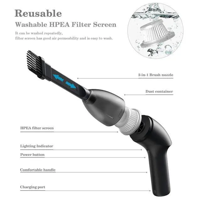 Net Weight: About 0.76 lb (345g) Package Includes 1 x Mini Vacuum Cleaner 1 x 2 in1 Vacuum Nozzles 1 x USB Charging Cable 1 x Storage Bag 1 x Manuals? If you want to buy a new filter, Please contact us via email so purchase more new filters? Any questions, please feel free to contact us, we will provide you with a satisfactory solution.