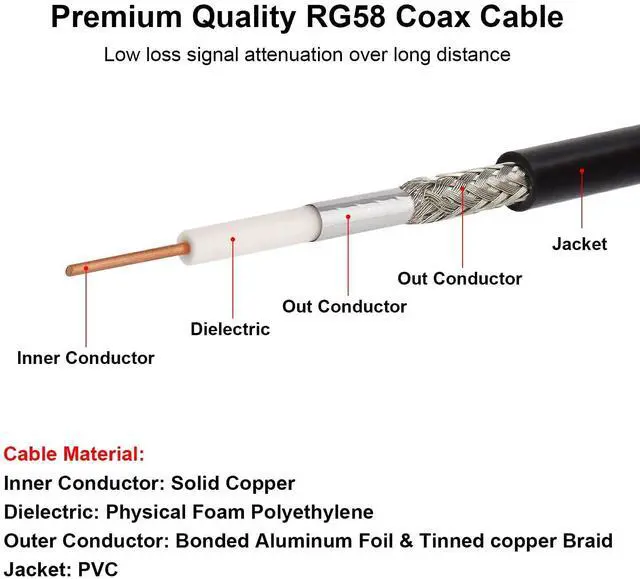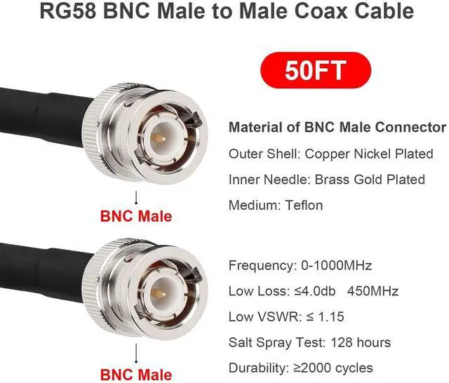 [LOW LOSS] - This low loss bnc cable is made of highly tinned copper braid shields and pure copper which could maximum protect the signal over large distance. ^^ [LOW VSWR] - The VSWR of this bnc coax cable is 1.15 on 450MHZ. The bnc cable doesn't introduce static nor interference when inserting your devices and 100% highly shield performance. ^^ [Well Built Structure] - The inner conductor of this rg58 bnc cable is made of solid copper, the outer conductor is made of bonded Aluminum foil and tinned copper braid. It could be better in resist oxidation and corrosion.