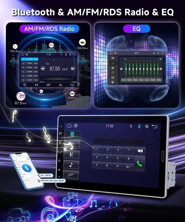 EQ: 10.1 inch Single Din Car Stereo with bluetooth 5.2, support hands-free answering and making calls, playing music intelligently. FM/AM/RDS radio with high-quality stereo, which can search channels in full-automatic ways, semiautomatic way and acurate adjustment way, Listen to music, newsletters and traffic information anytime, anywhere. Hardware electronic sounds (EQ) processing, multiple EQ modes, treble and bass can be adjusted. ^^ Rear View