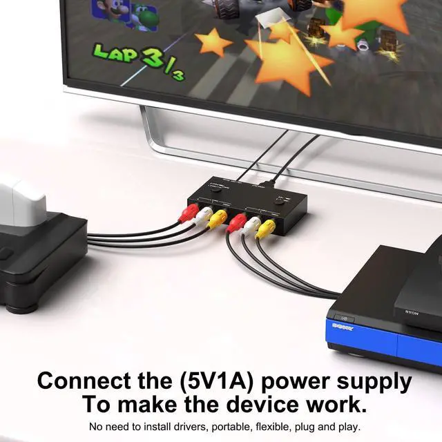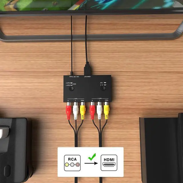 HDMI Converter: Connect 2 RCA signal sources to an HDMI TV (such as DVD and Nintendo switch) and use the switch button to switch the input to avoid frequent plugging and unplugging. ^^ Plug and play, no need to install driver. ^^ Support 4: 3 and 16: 9 switch. ^^ AV to HDMI Converter Compatible with WII, N64, PS2, PS3, STB, VHS, VCR DVD Players, TV and Projector, etc.