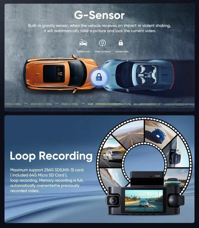 Sensor Technology: The built - in G - sensor automatically detects sudden movements, such as collisions or hard braking. When an event is detected, the current video file is locked and protected from being overwritten during loop recording. This ensures that you have crucial evidence in case of an accident. ^^ 24/7 Parking ModeThe dash cam has a specially designed 24-hour parking mode that requires the additional purchase of a hardwire kit(Asin: B0BZL9WY5T). After it is installed and powered by the hardwire kit, when the car is turned off the dash cam will automatically start the time lapse recording mode at 1 second per frame, letting you know any events that happened after you left, and then return to the normal recording mode the next time you start the car.