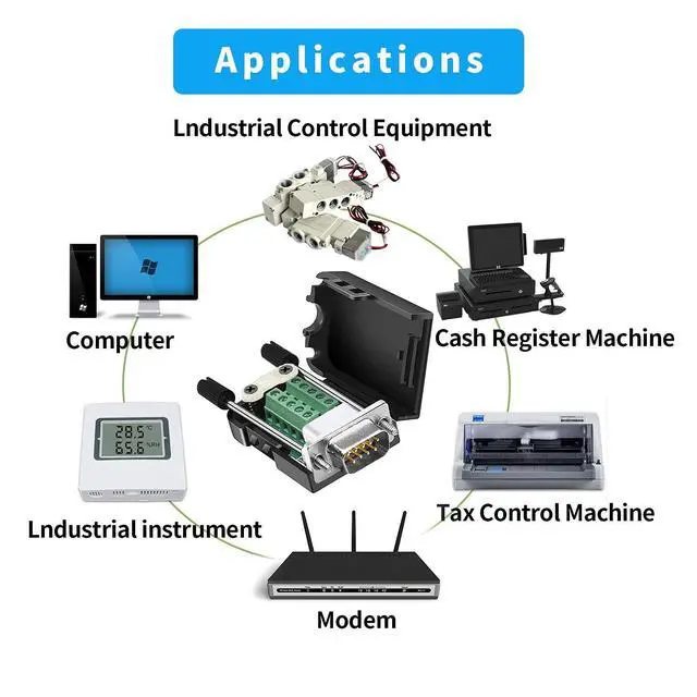 As Barcode Machine, set-top box, Ptz Camera Control etc. ^^ Package Content4Pack DB9 Male Connector Breakout Connector Solderless RS232 D-SUB DB9 Male Screw Terminal Block with Case Long Bolts Tail Pipe.