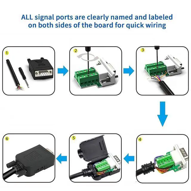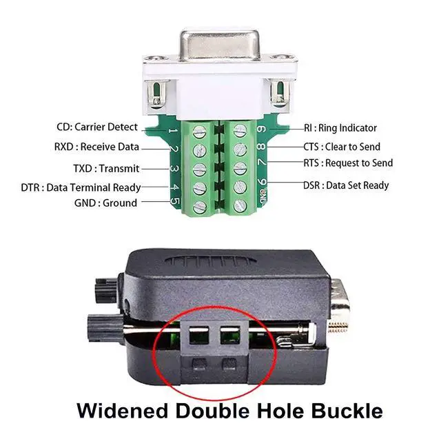 Excellent QualityBrand New and High Quality DB9 Solderless RS232 D-SUB Serial to 9Pin Port Terminal DB9 Male Adapter Connector Breakout Board. ^^ Powerful FunctionPure Copper Plated Joints, Fine Solder Joints, Resistance to Plug, And Good Contact to Ensure High-Quality, Durability and a Long Life. ^^ Easy InstallationAll Signal Ports Are Clearly Named and Labeled on Both Sides of The Board. The Housing is Designed with a Folding Buckle for Easy Assembly and Disassembly Without Tools. ^^ Widely ApplicationSuitable for Variety of Pin Connections Required to Use Serial Communications Industrial Control Products.