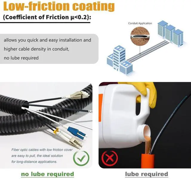 Low Friction LSZH jacket: Made of Ultra Low Friction flame retardant LSZH jacket (Coefficient of Friction < 0.2 ), which allows you quick and easy installation and higher cable density in conduit. ^^ Min.