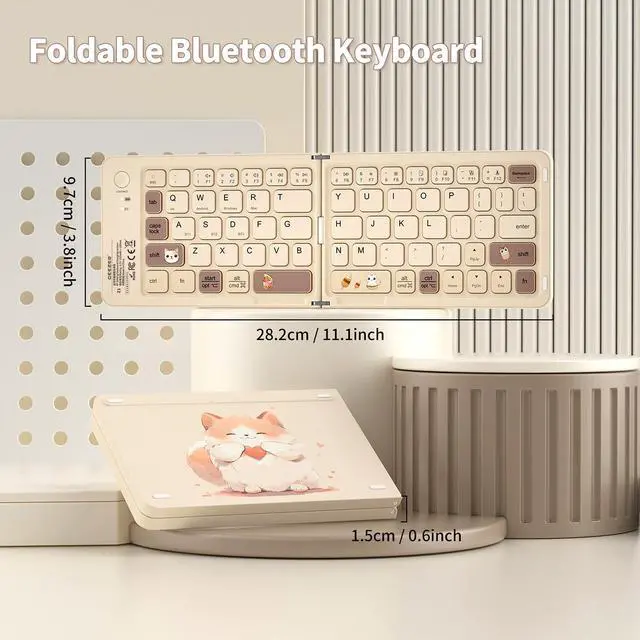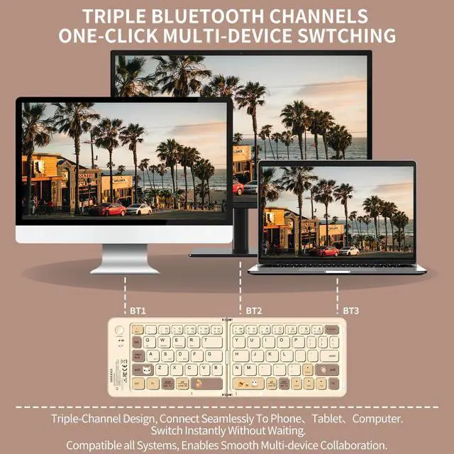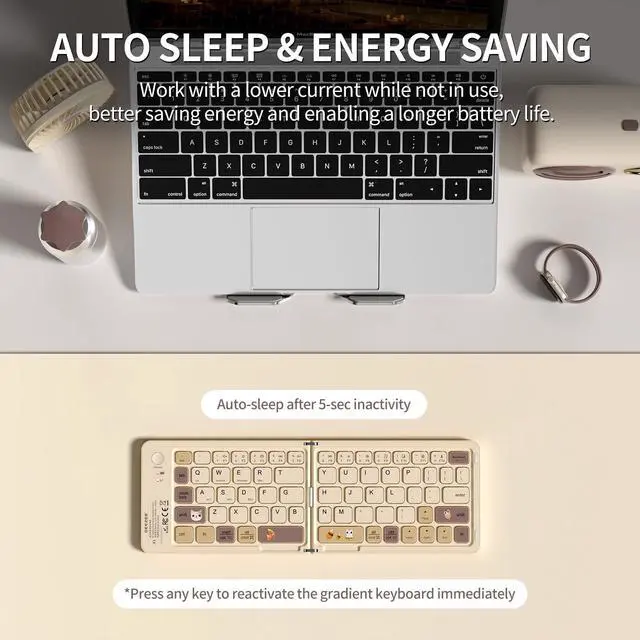 Portable Foldable Mini Keyboard& Space-Saving DesignOnly a 6.3 ounce palm-sized foldup lightweight keyboard is designed in two-fold and compact enough to save desk space and makes typing more comfortable anywhere in classrooms, dorm rooms, cafes, libraries, or while traveling. A great companion for studying, journaling, and slip into your bag or backpack for everyday use on the go. ^^ Bluetooth Keyboard for Multiple DevicesEquipped with advanced Bluetooth technology, this wireless keyboard supports stable connections across Windows, iOS, Android, and Mac OS. Supports up to 3 Bluetooth devices and allows easy switching between your phone, tablet, or laptop.