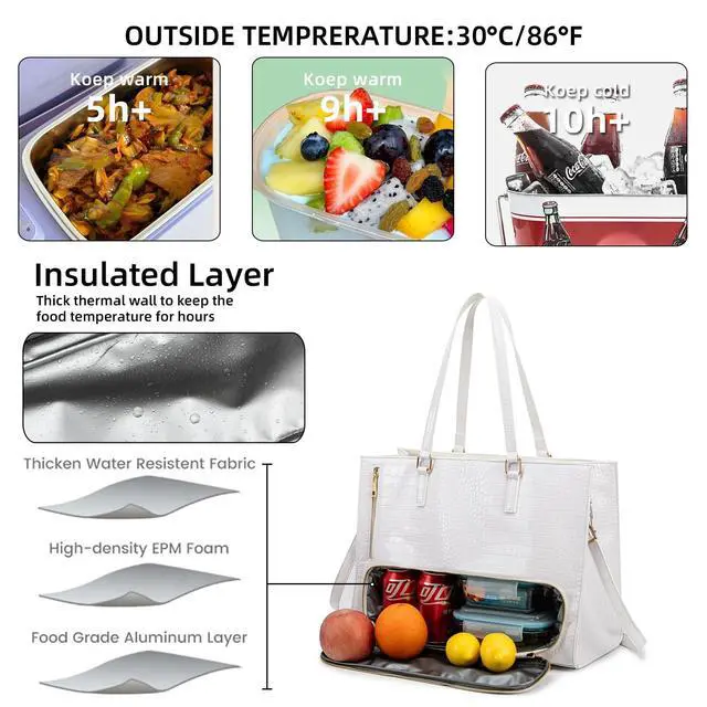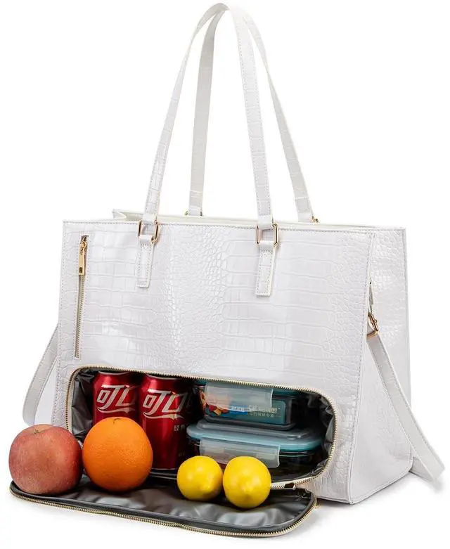 ROYALFAIR Lunch Tote Bag with Insulated Compartment for Women, 15.6 Inch Laptop Work Tote, PU Leather Work Bag, Waterproof Crossbody Bag for Teacher Nurse, White