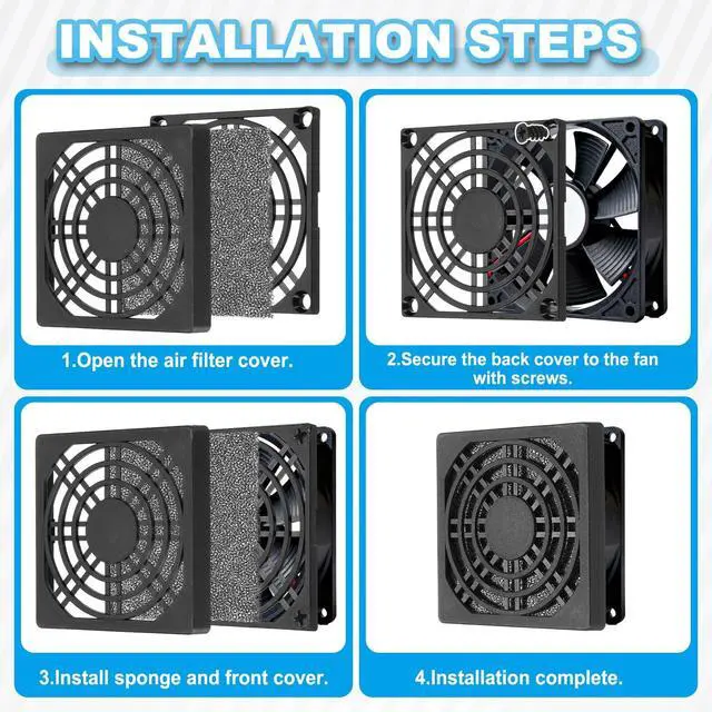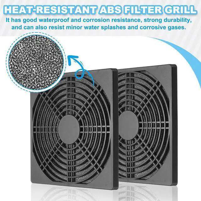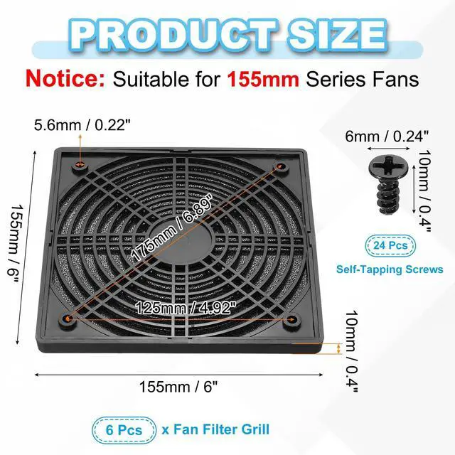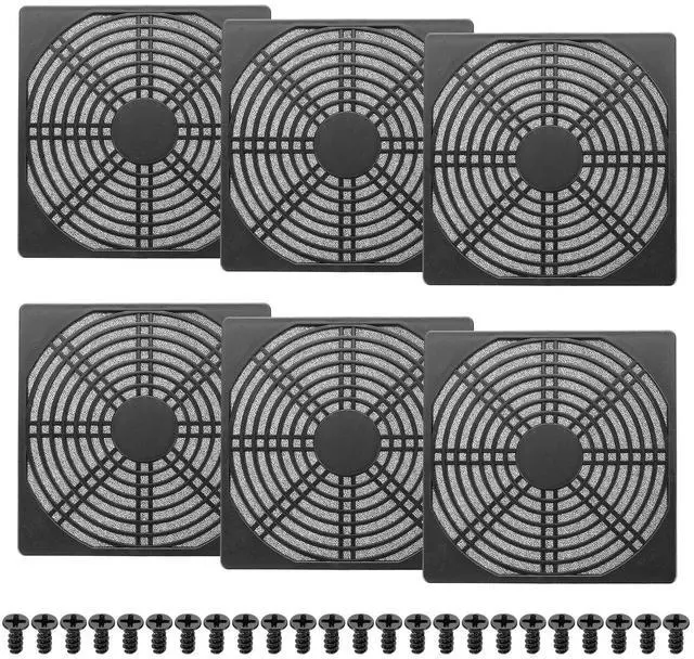 List: 6 Pcs Fan Filter Grill with 24 Pcs Self-Tapping ScrewsAdvantageThe fan grill integrates three functions: dust filtration, equipment protection, and heat dissipation. Not only does it prevent dust from entering and affecting equipment operation, but it also protects components such as fans from external damage, while maintaining smooth heat dissipation channels. The filter grill is made of heat-resistant ABS plastic material, which has good waterproof and corrosion-resistant properties. It has good flexibility, strong durability, and can also resist slight water splashes and corrosive gases. Countersunk self-tapping screws are made of carbon steel for strength and durability and nickel-plated for corrosion resistance and a smooth appearance. InstructionAlign the installation holes of the mesh cover with the reserved holes of the fan, and tighten and fix them one by one with matching screws. It is recommended to tighten them diagonally and step by step to ensure that the mesh cover fits seamlessly. NOTE