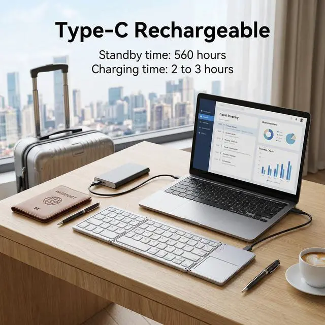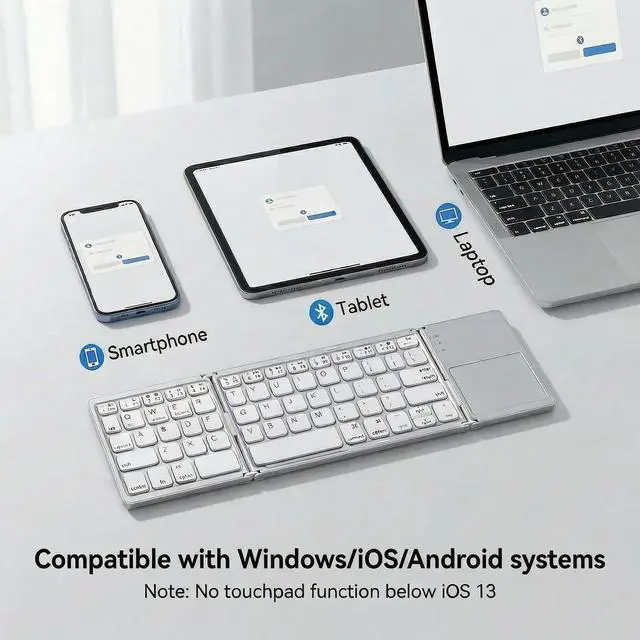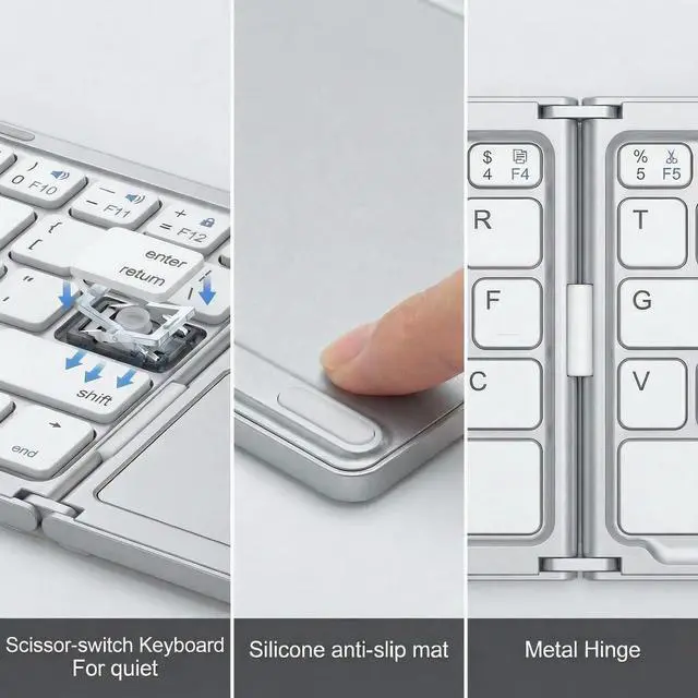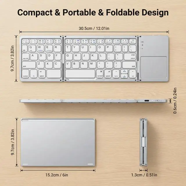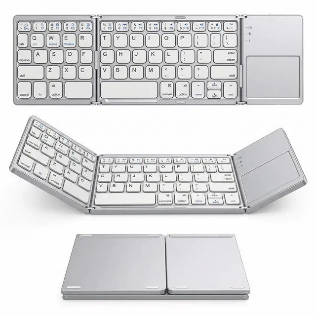 Unlike standard keyboards, this wireless keyboard foldable includes a responsive touchpad that enhances efficiency by enabling precise cursor control, scrolling, and gestures. Anti-slip silicone pads keep the keyboard stable during typing, even on smooth surfaces. Engineered for extended use, the portable wireless keyboard provides up to 48 hours of continuous typing and an impressive 560 hours of standby on a single charge. Magnetic closure ensures the folded keyboard remains secure while traveling, protecting keys from impact and accidental opening. Whether working on documents, responding to emails, or managing tasks on the go, this mini foldable keyboard delivers comfort, control, and portability without compromise.