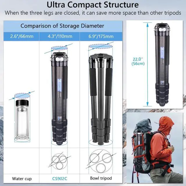 Easy-to-carry ultra-stable and multi-functional tripod: The top-grade carbon fiber material provides strong stability, and the compact design makes it more space-saving and easier to store and carry for outdoor photography. The accessory hole design allows the tripod to be connected to a mobile phone, LED light, microphone, etc., to meet the needs of more photography environments. ^^ Advantages of video camera carbon tripod: Heavy travel tripods can be compatible with both heavy photography equipment/DSLR cameras/shooting and mirrorless cameras/mobile phones, but other tripods can only be compatible with small equipment. Although it is a heavy-duty tripod, the carbon fiber material makes it lighter than aluminum alloy tripods. Convenient for travel and outdoor photography.