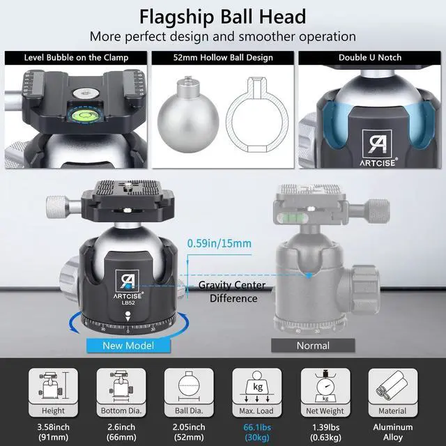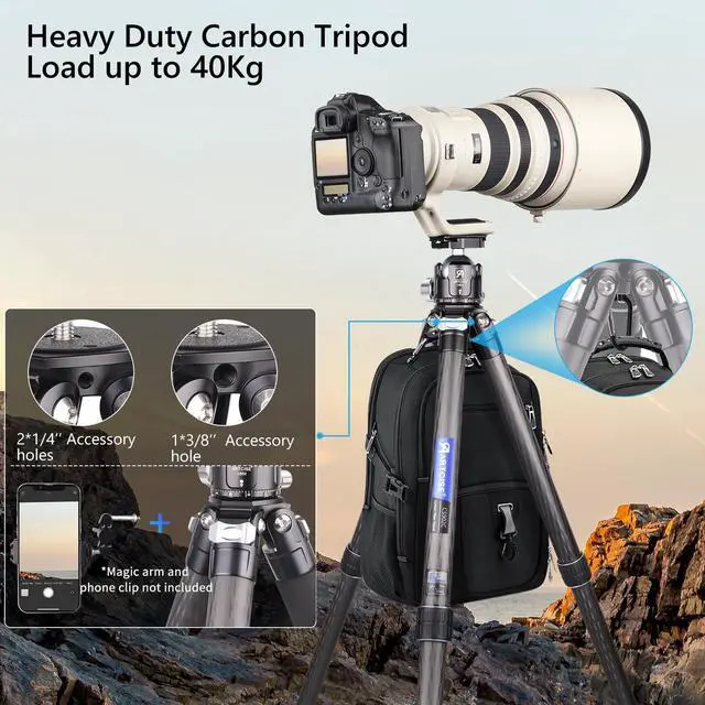 Newly upgraded compact design heavy-duty carbon tripod: It features a 40mm tube diameter + external center column compact design + new accessory holes design. It is equipped with a 52mm large ball low center of gravity tripod ball head. The maximum Load capacity of the tripod reaches 88.2 lbs /40kg. It is suitable for wild hunting, bird shooting, and wild animal photography. ^^