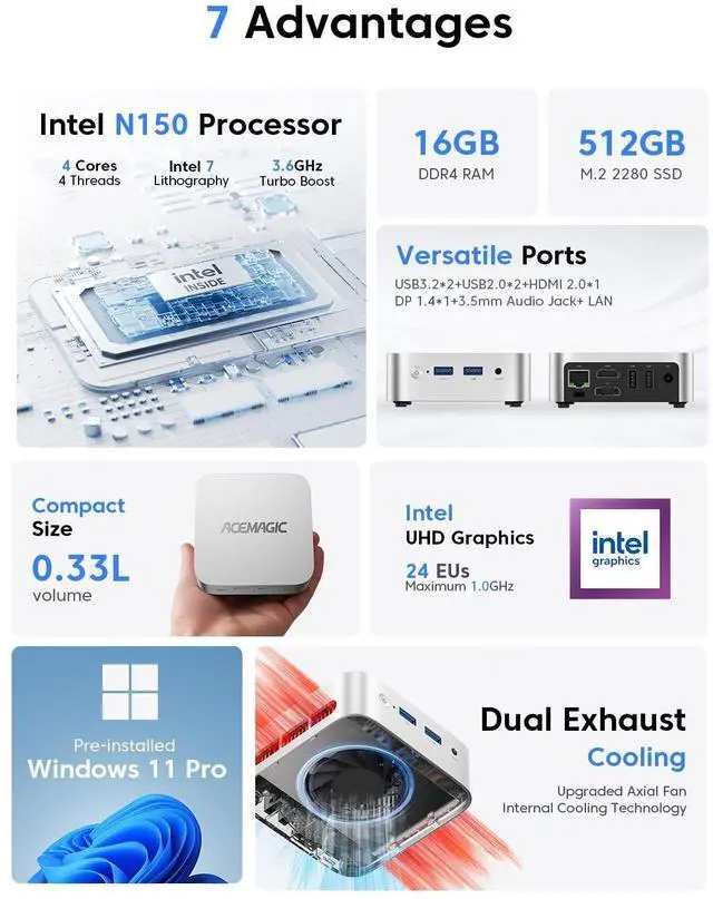 WiFi 6: Productive acemagic mini pc This acemagic mini pc supports dual 4K@60Hz outputs via HDMI 2.0 + Type-C, ideal for business (dual monitors for data comparison) or home theater (4K HDR movies) a step up from basic mini pc models with only single HDMI. Equipped with WiFi 6 (3x faster than WiFi 5) and Gigabit Ethernet, it delivers smooth video calls and 1GB file transfers in 10 seconds; Bluetooth 5.2 links wireless devices instantly, making this pc mini a reliable pick for remote work and entertainment. ^^ Aluminum Cooling + <22dB