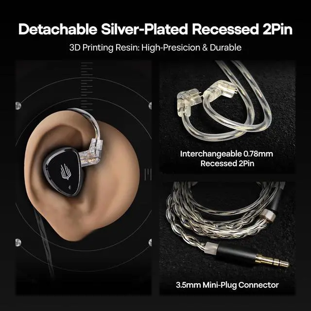 ^^ - - The included silver-plated OFC cable ensures enhanced signal conductivity, allowing every musical nuance to be faithfully transmitted without compromise. The cable is interchangeable, allowing for future upgrades and personalization. The dual-pin male and female socket system, combined with the positioning groove, ensures exceptional durability and reliability. Listen to music in its truest form, with unparalleled clarity and fidelity.