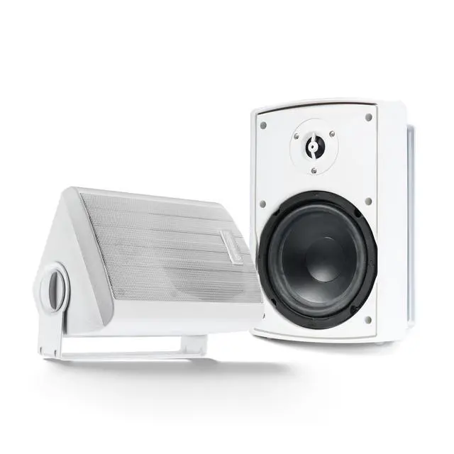 POWERFUL 150W STEREO EXPERIENCE Elevate your outdoor audio with 150W of peak power delivered through 5.25 low-frequency woofers and 0.75 tweeters. This balanced pair provides a deeper 45Hz20kHz frequency response, ensuring rich bass and clear highs for medium-sized outdoor spaces. ^^ RUGGED ALL-WEATHER CONSTRUCTION Built to withstand the elements, these speakers boast an IP44 waterproof rating with a durable ABS cabinet and aluminum grill. Whether installed in a backyard or on a boat, the rust-proof design ensures year-round durability against rain and moisture. ^^ EASY ACTIVE/PASSIVE INSTALLATION This system consists of one active master speaker and one passive slave speaker, connected by 26 feet of 18 AWG speaker wire.