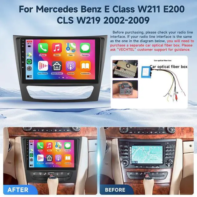 Applicable Car Models: Our 2G+64G touchscreen car radio is suitable for Mercedes Benz E Class W211 E200 CLS W219 2002-2009. Please Note that if your original car has fiber optic as the one above the picture, you may need a fiber optic box. Please let us know before purchasing ^^