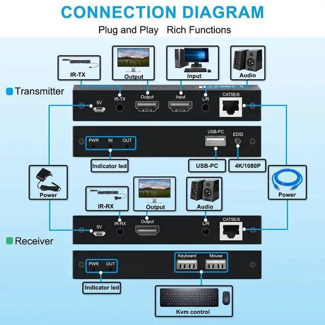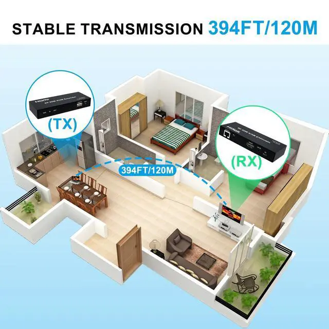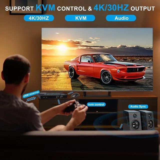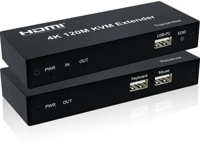 HD 4K@30HZ Input and OutputHDMI supports input and output 4K@30Hz/1080p/720p/576p/576i/480p/480i, and the EDID button supports switching between 4K@30H and 1080p, immersing you in amazing video clarity and seamless visual smoothness, which is ideal for conferences and Movie. ^^ HDMI Over Single Ethernet Up To 394ft/120mEffortlessly extend your HDMI signal up to 394ft/120m. via a single ethernet cable without any signal attenuation. In addition, both the transmitter and the receiver support 3.5MM left and right channel stereo audio output. Meet your office and audio-visual needs. ^^ Kvm ControlThe USB port of the transmitter gets hooked up to the USB port of the computer, and the two USB ports of the receiver get linked to the mouse and the keyboard.
