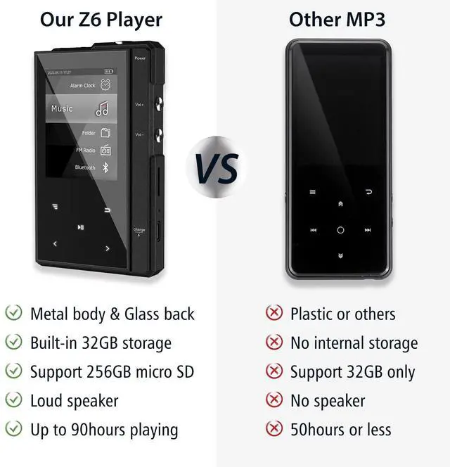 Speaker & Stereo Sound: Our Z6 Bluetooth MP3 player with a build-in speaker offer loud volume stereo sound, super HD sound allows you to enjoy the music feast. It supports most audio formats such as APE, FLAC, MP3, OGG, AAC, ACELP, WMA, WAV, support video format such as AMV, AVI, you can make bookmark in an audio-book. It also supports FM radio and voice recorder. ^^ -MP3 Player with