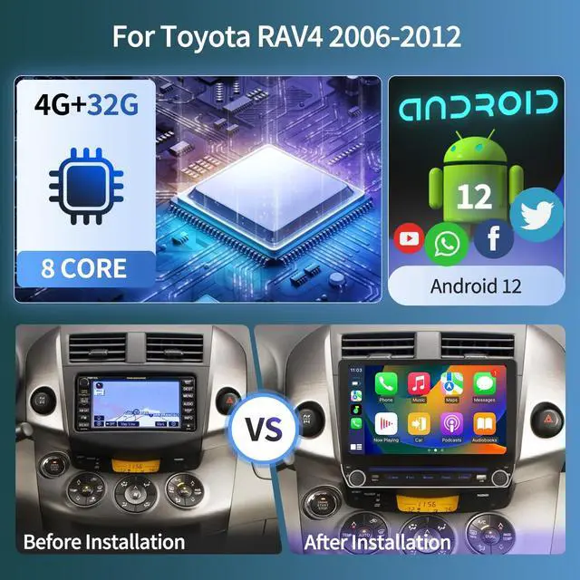 Car Radio Stereo for Toyota RAV4 This car stereo radio is designed for Toyota RAV4 (Compatible with JBL & Non-JBL) 2006 2007 2008 2009 2010 2011 2012. UPGRADED Android 13 operation system, 8 Core CPU, 4G RAM, 32GB ROM with enhanced fluency, compatibility, and privacy. Equipped with a 10.1 -inch large screen, you can better control this machine. 100% standard size, no need to purchase additional accessories, just follow the installation instructions to make your car a new look. ^^ 7-color Ambient Light for ButtonsUpgrade your drive with this car radio featuring uniquely customizable buttons that glow with 7 vibrant color options.