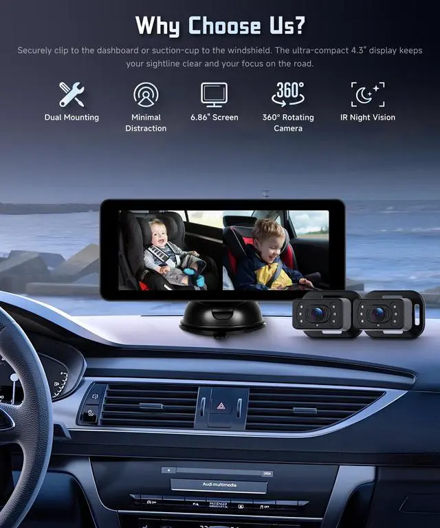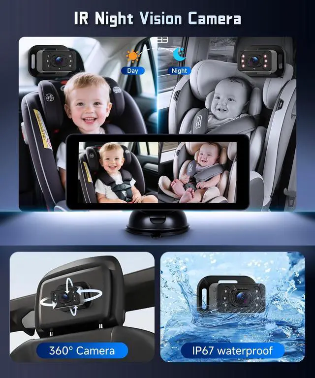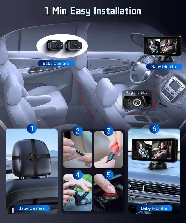 This feature ensures safety during late-night drives. The Baby Monitor function allows you to keep an eye on your baby even in the dark ^^ Easy Monitoring with a 6.86IPS DisplayThe large 6.86 HD display offers a clear view of your baby. The suction mount ensures stability and flexible placement in any car. This allows you to monitor your baby without taking your eyes off the road. The Car Monitor for Baby is user-friendly and reliable ^^ Quick and Easy SetupThe Baby Car Camera is designed for easy installation. Simply attach it to the headrest, connect the monitor, and plug it in.