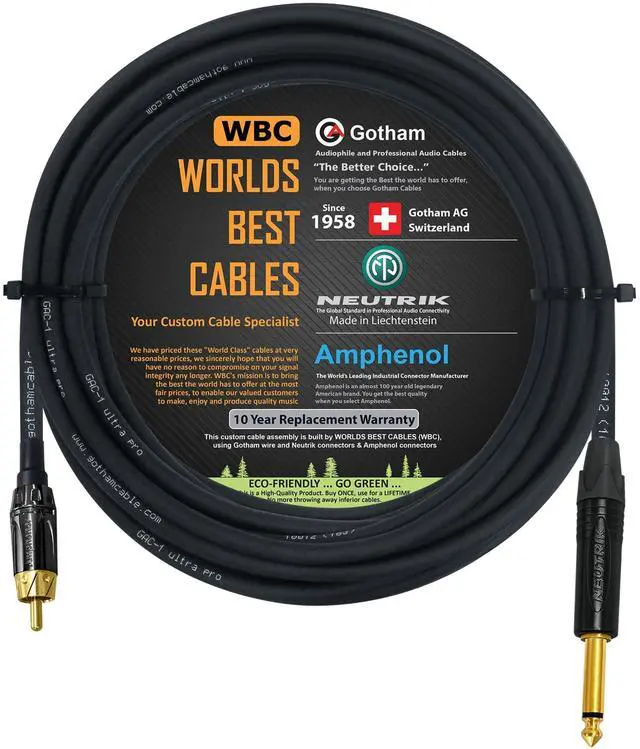 Custom Made 20 Foot - Gotham GAC-1 Ultra Pro (Black) - Premium, Low-Capacitance (21 pf/F) TS to RCA Cable - The Gotham GAC-1 Ultra Pro boasts Gotham's unique double Reussen shielding (2 counter woven 100% coverage spiral copper shields) and two separate conductive PVC layers and Cellular PE insulation (almost all guitar cables in the market has a single shield and a single conductive PVC layer) - terminated with Amphenol ACPL-CBK - Black Chrome Body, Gold Plated RCA Connector (Black color boot) & Neutrik NP2X-B Gold Male Inch Straight TS Connector One of the highest-end TS to RCA cables in the market!