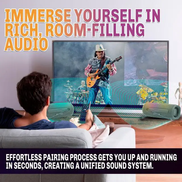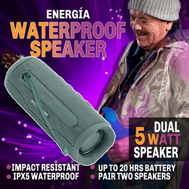 Elevate your music experience with the Santana Sounds Energia Bluetooth Wireless Speaker. Featuring dual 5 Watt speakers, this speaker delivers high-definition sound with deep bass and clear treble, ensuring an immersive listening experience. Enjoy seamless connectivity with Bluetooth technology, allowing you to wirelessly stream music from your devices. With up to 20 hours of playtime on a single charge, the Energia speaker ensures extended enjoyment wherever you go. Enhance your audio setup by pairing multiple Energia speakers for a synchronized sound experience. The rugged, waterproof, and impact-resistant design makes this speaker ideal for outdoor adventures and active lifestyles.