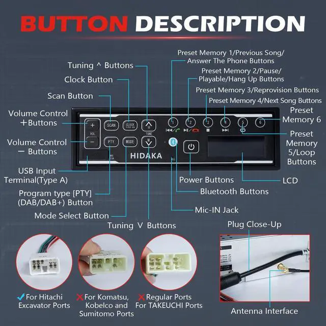 Package Includes: 1 X Hi-M505 Excavator Radio; 1 X Instruction Manual (Refer To Manual For Specific Operation) ^^ ApplicationOEM new For Hitachi excavator radio replacement parts; Please pay attention to avoid burning fuses due to wiring errors during installation. Full name, correct telephone number and detailed Physical Address ( home or office address) but not PO Box/APO/FPO address are necessary; please tell us the model of your vehicle once you place an order. ^^ Designed For Vibration Resistance The electronics tractor radio is internally stabilized with high stabilization technology so that the radio effect is unaffected even when performing difficult excavator work. ^^ Functional HI-M505 Radio for excavator no need your hands, make homework operation safer. Multi-channel reception for more news information. Car radio, plug and play, no need for complicated installation steps. ^^ Longer Service Life This tractor radio have quality smaterial and excellent crafts, as well as the applied series of tests in center before they were listed, provide a operation and longer service life of this item.