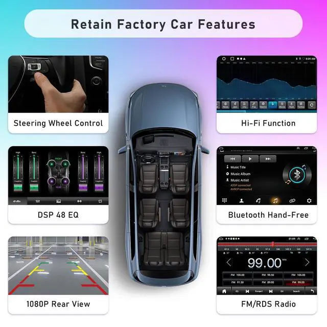 SWC buttons: answering calls, adjust volumes, change musics or videos. Safer driving without distraction. allowing you to stay focused and in control while enjoying the features at your fingertips. ^^ Powerful 48-EQ & Professional DSPWith the 48-EQ, you can adjust the position of the voice point according to your seat position, ensuring that you enjoy a pure and immersive audio experience every time you hit the road. our system provides six Surround Sound patterns, Bass Boost, and individual speaker volume control, giving you control over your audio setup. Bring joy and happiness to your driving journey.