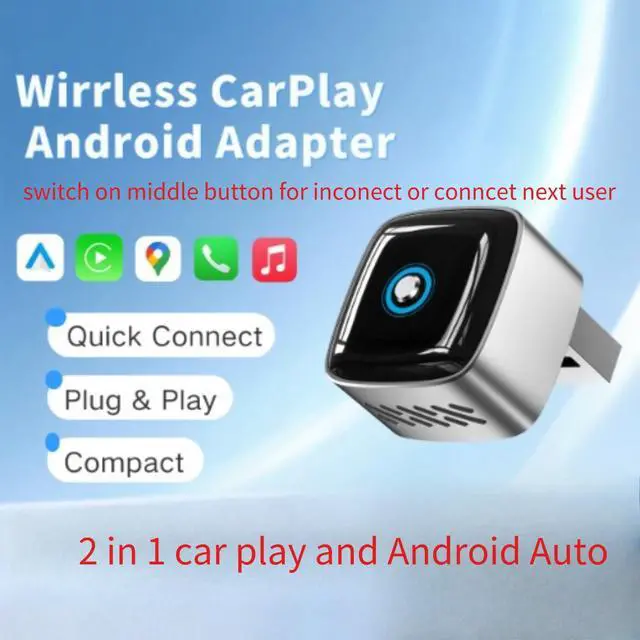 Compatibility: Fully supports for iPhone 6 and later models running iOS 10 or above ^^ suitable for Android Auto phone was Android 11+ or above ^^ plug wireless adapter into your car's USB port or USB-C port that under bluetooth logo (not the charging port) search and match wireless adapter via Bluetooth or Wi-Fi on your phone and pairing for it ^^ wireless adapter With A7 chip 5.8 GHZ WiFi, 5.3 Bluetooth and 8-core processor for CarPlay genius makes transmission rate by up 40% not worry about disconnection when driving for a long time ^^ A7 chip will automatic reconnection every time when you start your car, without repetitive manual pairing ^^ Metal hollow out design to prevent overheating and Effective heat dissipation ^^ Wireless adapter dongle is compatible with 98% of vehicle models 2015+ that equipped with original factory wired CarPlay. ^^ No Latency and Seamless Connection for Convert Wired to Wireless Car Play Adapter between your phone and car ^^ press middle button for disconnect or connect and change the phone user to the other one, perfect for family members husband and wife use the same car and same adapterBoth phones had connected to this adapter before