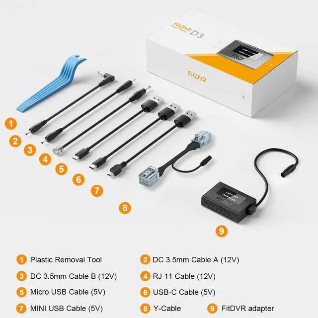 Vehicle CompatibilitySuitable for Mazda vehicle models equipped with sun roof. Please note that if your car does not have a sunroof it will not be compatible. ^^ Dual Voltage OutputInput voltage is 12V, with output options of 5V (USB cable) and 12V (DC 3.5 mm cable). ^^ 6 Output Cables IncludedIncludes DC 3.5 mm Cable A (12V), DC 3.5 mm Cable B (12V), RJ 11 Cable (12V), Micro USB Cable (5V), USB-C Cable (5V), and MINI USB Cable (5V). ^^ LED DisplayThe FitDVR adapter features an LED screen that displays current and voltage, a unique feature compared to other brands.
