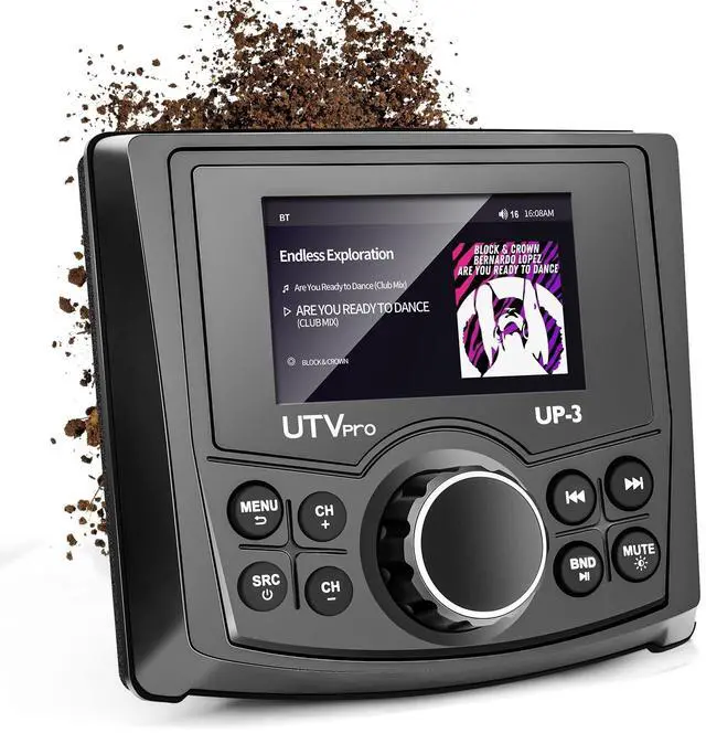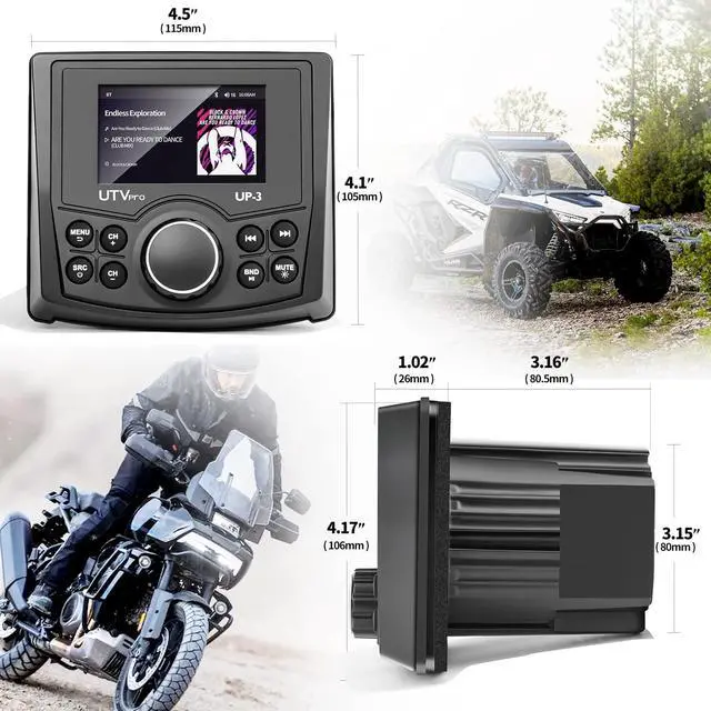 ^^ 4Scope of application: UP-3 Marine stereo Bluetooth is small in size, easy to install, space-saving, and easy to operate. UTVPRO audio is suitable for mountain off-road vehicles, 7-8M small yachts, golf carts, and Harley motorcycles.